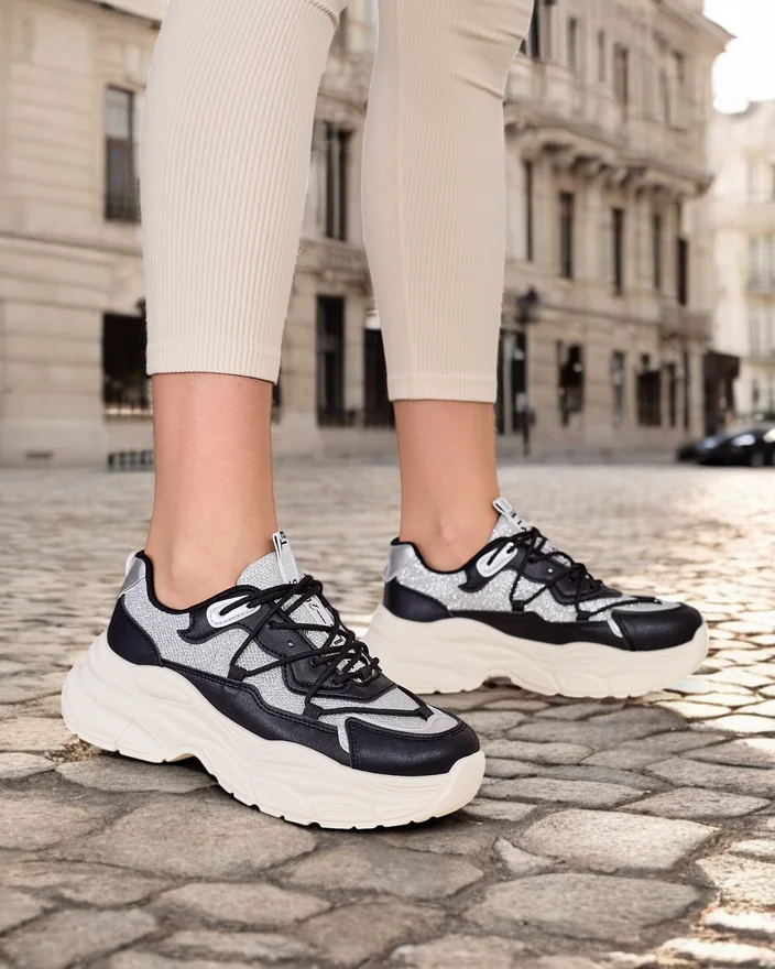 - Moteriški sportiniai bateliai sportbačių stiliumi su storu padu. Pagaminti iš ekologiškos odos su blizgiomis įmautėmis. Audinio pamušalas. Puikus papildymas jūsų kasdieniams laisvalaikio drabužiams!