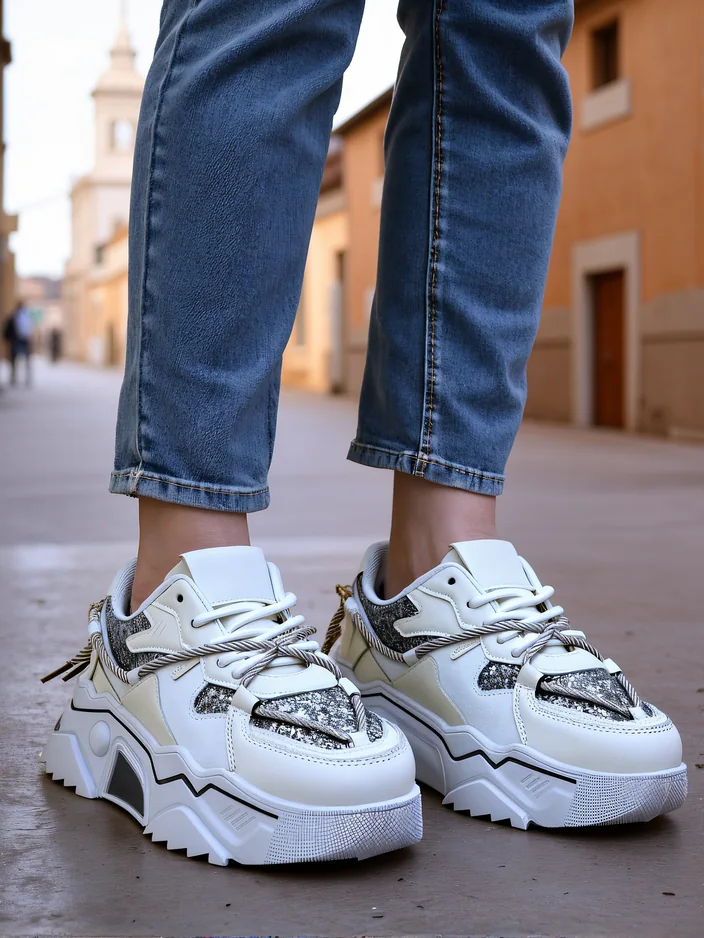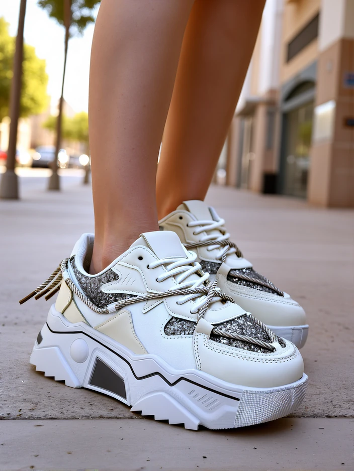 - Moteriški sportiniai batai sneakers stiliumi su storu padu. Pagaminti iš ekokailio ir audinio, kartu su ekokailio padais. Puikus papildymas jūsų kasdieniams laisvalaikio drabužiams!
