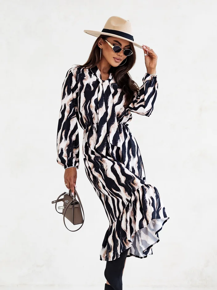 - Moteriška midi suknelė su printu, ilgomis rankovėmis ir rišamu kaklu. Modelis turi elastingumą liemens srityje ir laisvą kirpimą. Puikiai tinka kasdieniam dėvėjimui! PASTABA: Matavimų tikslumas (+/-) 1 cm.