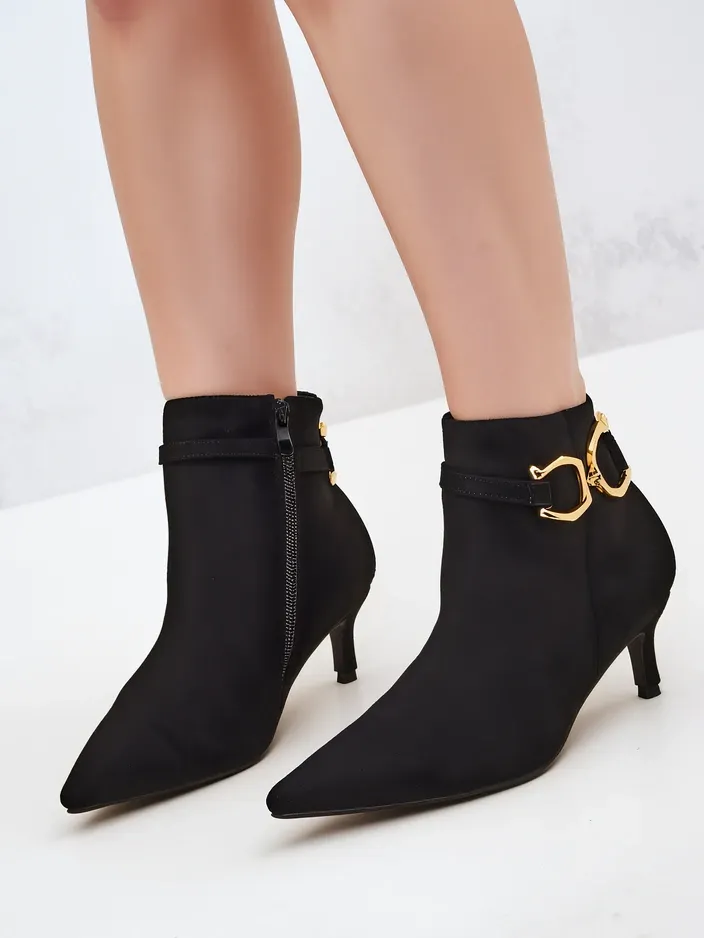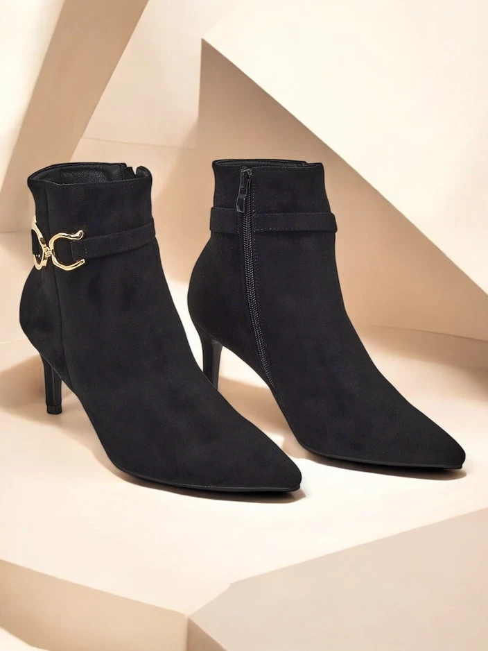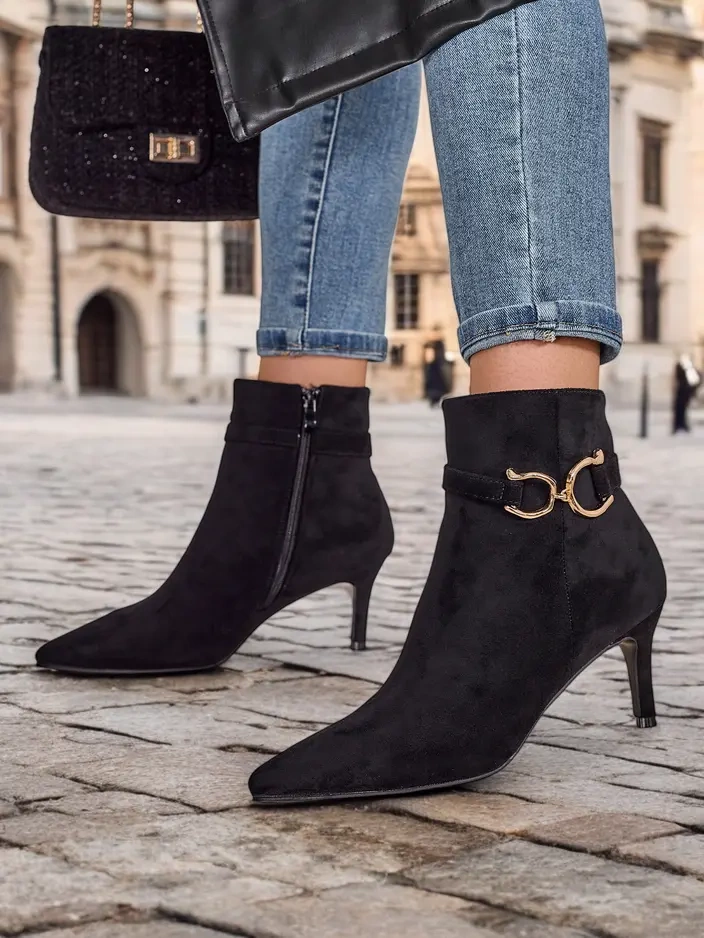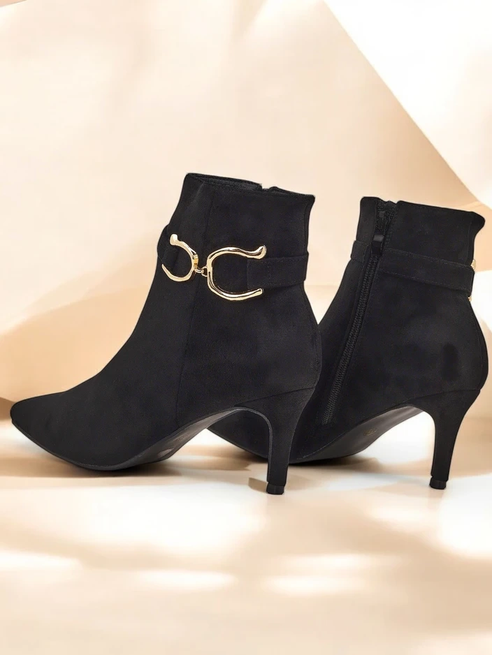 • Elegantiški aulinukai ant stiletto aukšto kulno, pagaminti iš ekologiškos suedes odos. Smailas kumštis, su izoliacija kaip kailis. Šoniniai užtrauktukai ir auksinė dekoracija. Puikūs batai rudens aprangai!