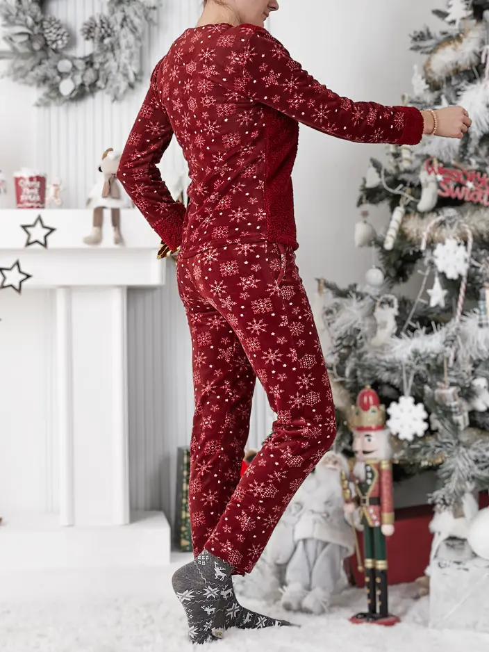 - Moteriškos 2 dalių pižamos su ilgomis rankovėmis ir ilgomis kelnėmis, pagamintos iš pūkinio audinio. Modelis papuoštas raštu. Puikiai tinka jaukiems vakarams namuose! PASTABA: Matavimo tikslumas (+/-) 1 cm.