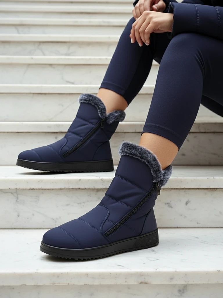 - Puikūs moteriški žieminiai sniegainiai su plokščiu kulnu. Viršus pagamintas iš audinio, o vidus yra izoliuotas su kailiu. Modelis turi užtrauktuką. Ideali bazė žiemai!