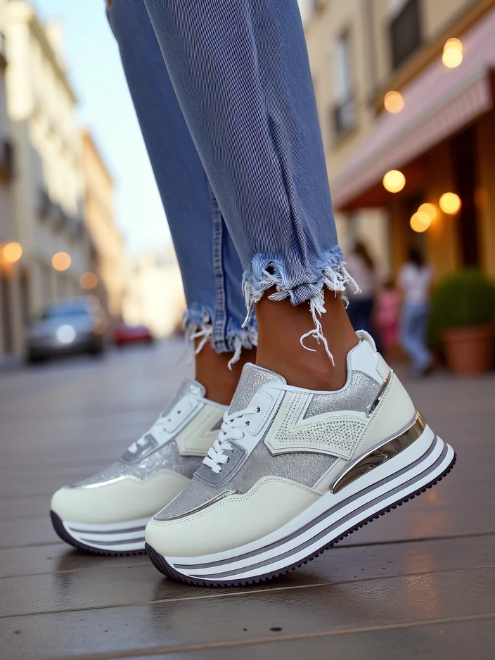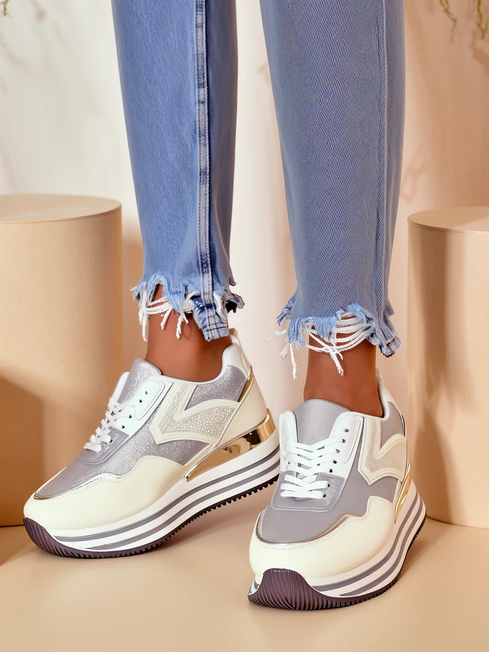 - Moteriški sportiniai bateliai sportbačių stiliumi su storesne padu. Pagaminti iš ekologiškos odos ir blizgučių medžiagos su audiniu įdėklu. Puikus priedas prie jūsų kasdienių laisvalaikio drabužių!