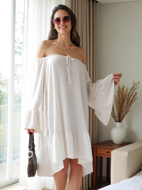- Nuostabi a'la Ispaniška suknelė, pagaminta iš lengvos, orinės medžiagos. Kelių ilgio modelis su ilgomis rankovėmis, puoštais volanais ir elastingu apykakle, kuri pabrėžia siluetą. Pilna žavesio ir lengvumo!