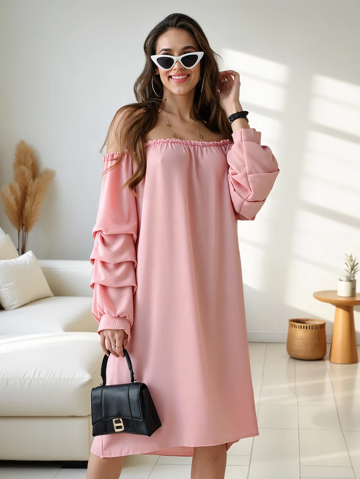- Nuostabi suknelė a la Ispaniškai, pagaminta iš lengvos, tekanti medžiagos. Kelių ilgio modelis su ilgomis rankovėmis, papuoštomis volanais ir elastiku kaklo linijoje, pabrėžiančiu siluetą. Pilna žavesio ir lengvumo!
