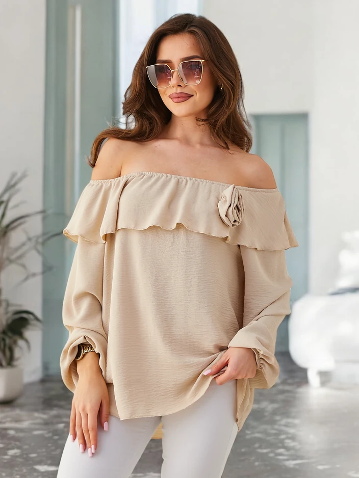 - Off-the-shoulder palaidinė su volančiumi ties kaklu yra elegantiška ir moteriška pasirinkimas bet kokiai progai. Su elastine juostele ties kaklu ir ilgomis rankovėmis, ji puikiai priglunda prie silueto, suteikdama komforto ir judėjimo laisvės. Subtilus vo