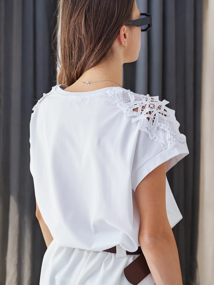 Royalfashion moterų medvilninis marškinėliai su nėrinių rankovėmis