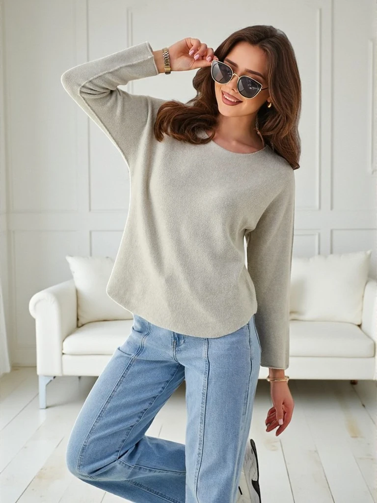 • Damski sweterek wykonany z lekkiej, wiskozowej tkaniny. Posiada długie rękawy i okrągły dekolt, zapewniając komfort i elegancję w codziennych stylizacjach. Dostępny w różnych kolorach, pozwala na łatwe dopasowanie do każdej garderoby!