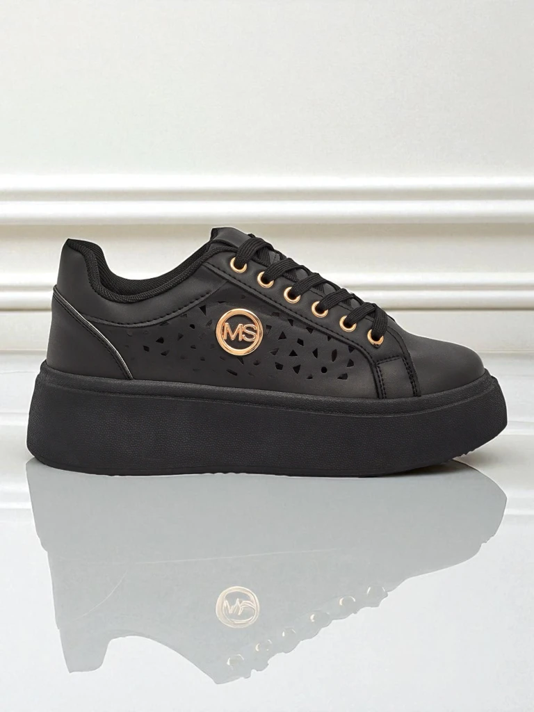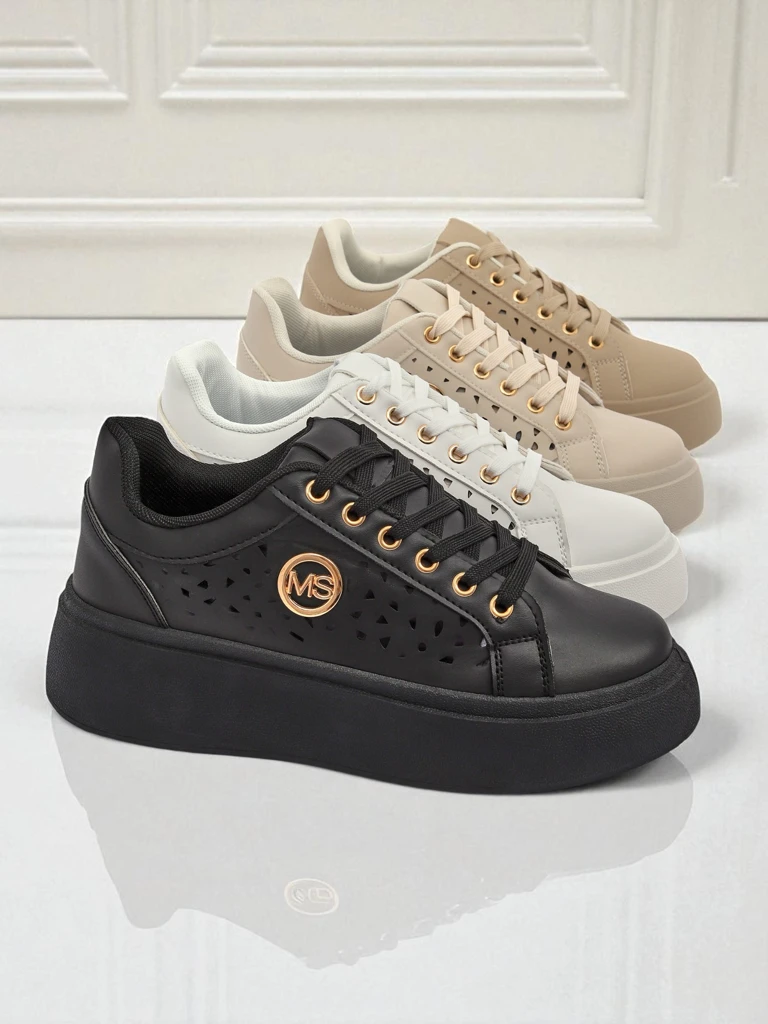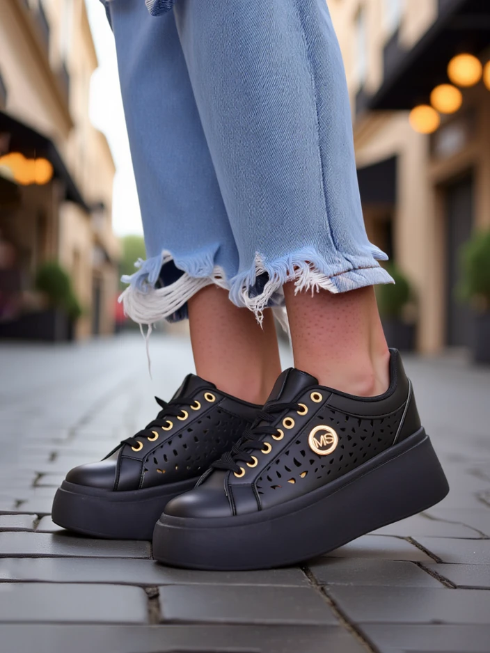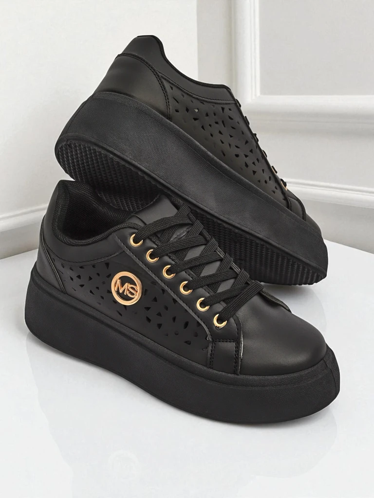 Buty Aurelia Nero od Royalfashion to propozycja dla kobiet ceniących wyrazisty styl i komfort. Wykonane z eko skóry, zapewniają wytrzymałość i łatwość pielęgnacji. Nowoczesny model sneakersów na platformie z geometrycznymi wycięciami i złotymi akcentami. Wnętrze wyściełane miękką tkaniną, platforma 5 cm optycznie wydłuża sylwetkę i amortyzuje kroki. Podeszwa typu platforma dodaje pazura, czarny kolor pasuje do wszystkiego. Lekkie, odpowiednie na wiosnę, lato i jesień. Stylizacje: casual z jeansami, sportowa elegancja ze spódnicą, streetwear z dresami. Czyścić wilgotną ściereczką, przechowywać w suchym miejscu. Platformy królują w trendach, Aurelia Nero to wybór dla kobiet poszukujących nowoczesnych i uniwersalnych butów.