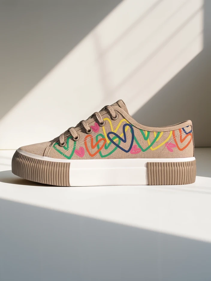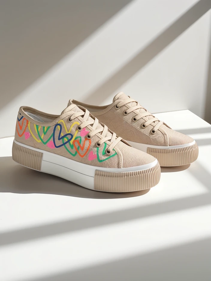 • Moteriški sportbačiai, pagaminti iš audinio. Viršus yra su raišteliais ir puošiamas širdelės raštu. Padas yra klasikinis guminis. Šie batai puikiai tiks kasdieniam dėvėjimui!