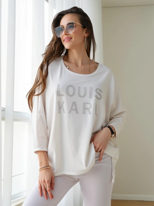 - Originali moteriška bliusonė su apvaliame iškirpte, pagaminta iš švelnios ir malonios liesti medžiagos. Visoje gaminio plotmėje yra subtilus blizgučių užrašas, o ilgos rankovės suteikia lengvumo. Puikus pasirinkimas kuriant madingus ir stilingus įvaizdžiu