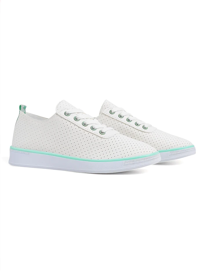 - Perforuoti moteriški sportiniai bateliai, pagaminti iš ekologo odos ir audinio pado. Modelis ant plokščio pado. Jie puikiai derės prie kasdienių aprangų!.