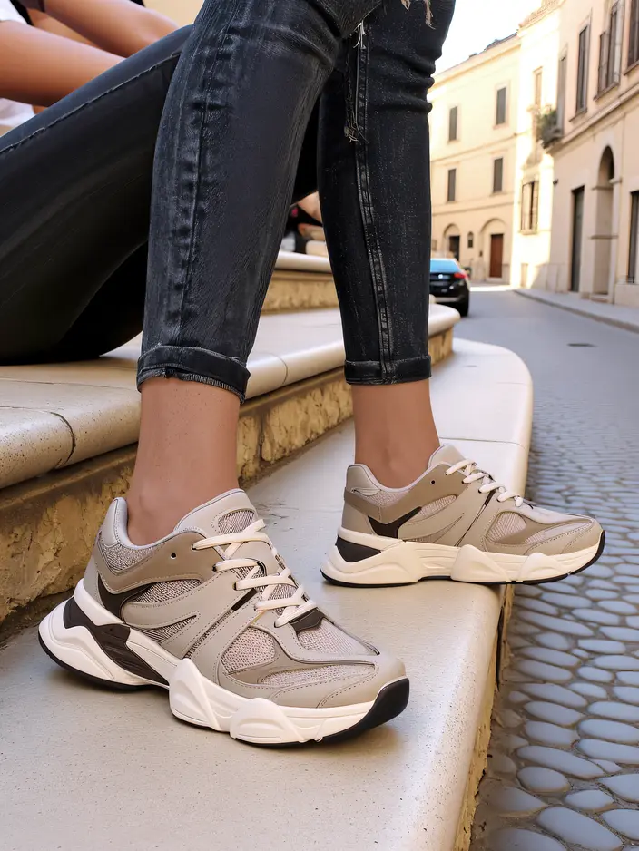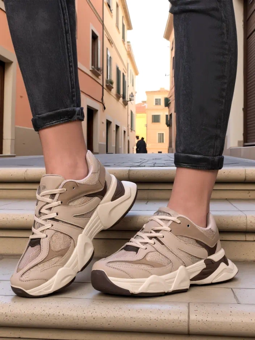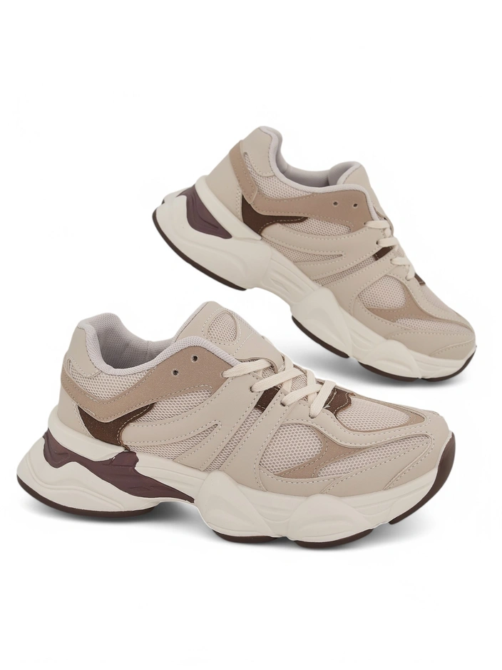 • Moteriški sportiniai bateliai, pagaminti iš ekonubuko ir tinklelio. Modelis su storesniu padu. Su raišteliais. Puikiai derės prie kasdienių drabužių!