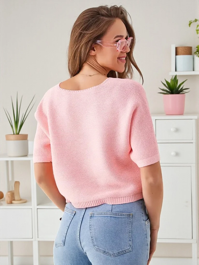 • Madingas moterų megztinis, pagamintas iš minkštos medžiagos, suteikiančios komfortą dėvint. Modelis turi V formos iškirptę ir trumpas rankoves. Papuoštas subtiliu gėlių raštu, kuris prideda žavesio ir moteriškumo.