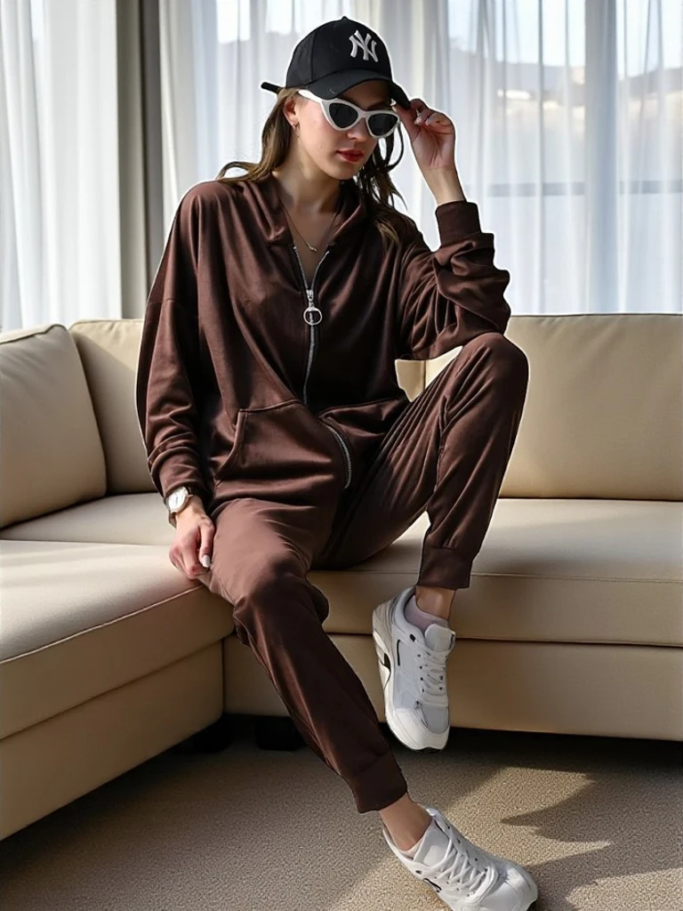 - Moterų komplektas a'la aksomas, pagamintas iš malonios medžiagos. Uždengiamas džemperis su gaubtu. Ilgos kelnės su elastinga juosta, 2 kišenės. Pajuskite stilių šiame nuostabiame komplekte!