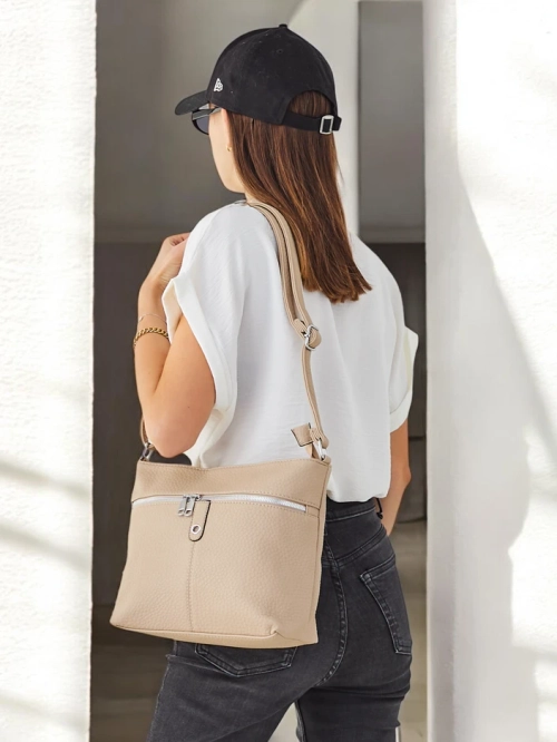 • Maža moterų rankinė su užsegimu ir užtrauktuku, pagaminta iš ekokožos. Modelis turi 1 skyrių, 3 vidines kišenes ir 2 išorines kišenes. Be to, jis turi nuimamą, reguliuojamą diržą. Puikiai tinka kasdieniam naudojimui!
