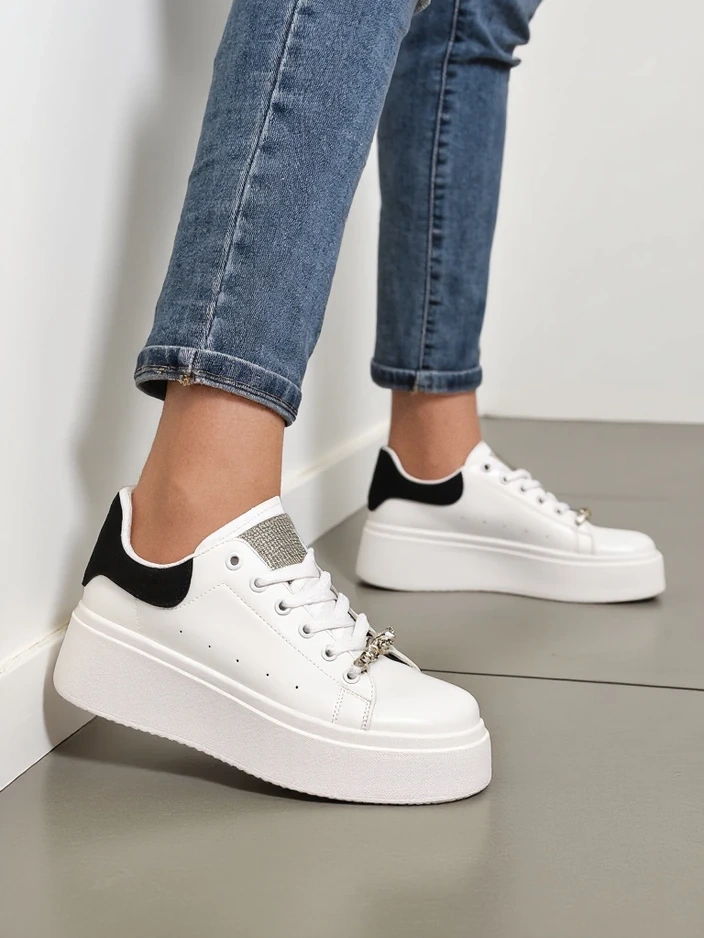 - Elegantiški balti sportiniai bateliai su blizgančiu metaliniu akcentu. Avalynė pagaminta iš ekologiškos odos ir audinio įdėjų. Puikiai tinka kasdieniams drabužiams.