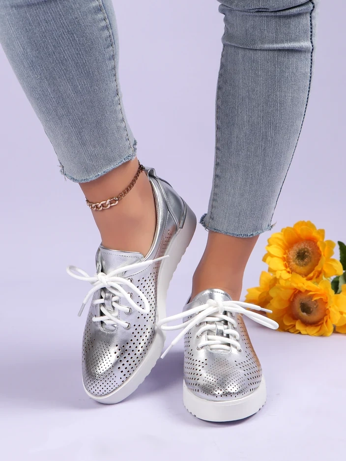- Moteriški perforuoti loafers su storesniu padu. Slip-on viršus pagamintas iš ekokodos, padas pagamintas iš ekokodos. Ideali bazė kasdieniams drabužiams!