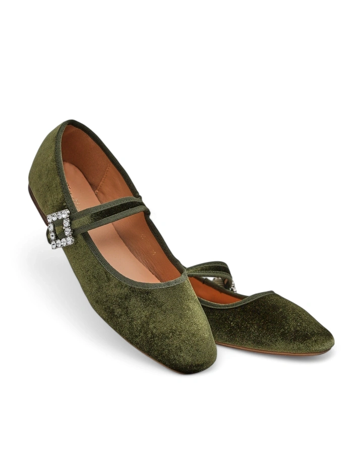 • Išskirtinės balerinos, pagamintos iš a' la velvet audinio su kvadratiniu pirštu. Viršus puošia subtili sagtis. Minkšta ekologiška odos padas užtikrina komfortą, o dirželis garantuoja, kad batai puikiai prigula prie kojos. Jie bus idealūs elegantiškiems ir