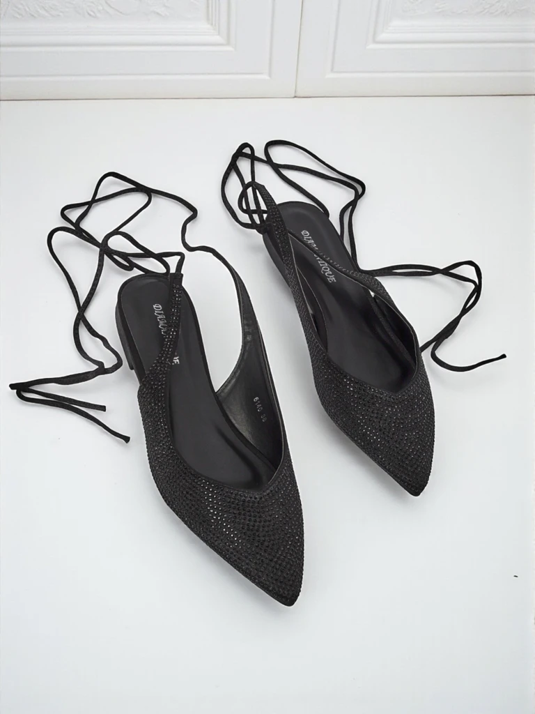 - These ballerinas are straight-up fire, made with fabric that's iced out with rhinestones and a pointy toe that's always on point. They got these cute little strings you tie up, and the soft eco-leather inside keeps your feet comfy AF. Perfect for when you