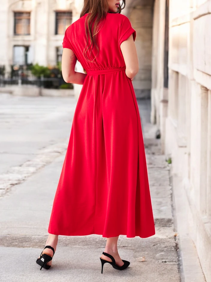 Royalfashion moterų midi suknelė su apvyniojamu iškirpimu, trumpomis rankovėmis ir diržu