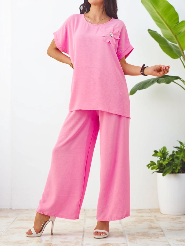 Royalfashion Moteriškas trumpų rankovių komplektas su dekoratyvine gėle ir plačiomis kelnėmis