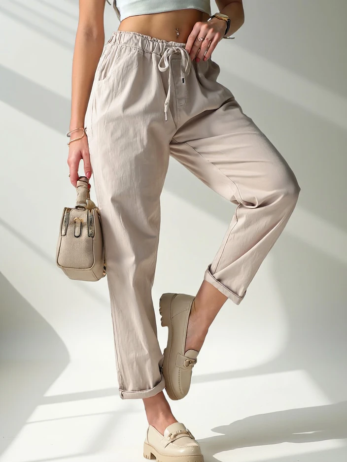 - Platesnės kelnės iš lengvo audinio, modelis pasižymi elastine juosmeniu ir dviem kišenėmis. Patogios ir praktiškos! PASTABA: Matavimo tikslumas (+/-) 1 cm.