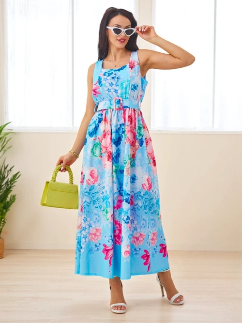 Royalfashion moteriškas višelinio midi suknelė su petnešomis, su diržu įvairiais gėlių raštais