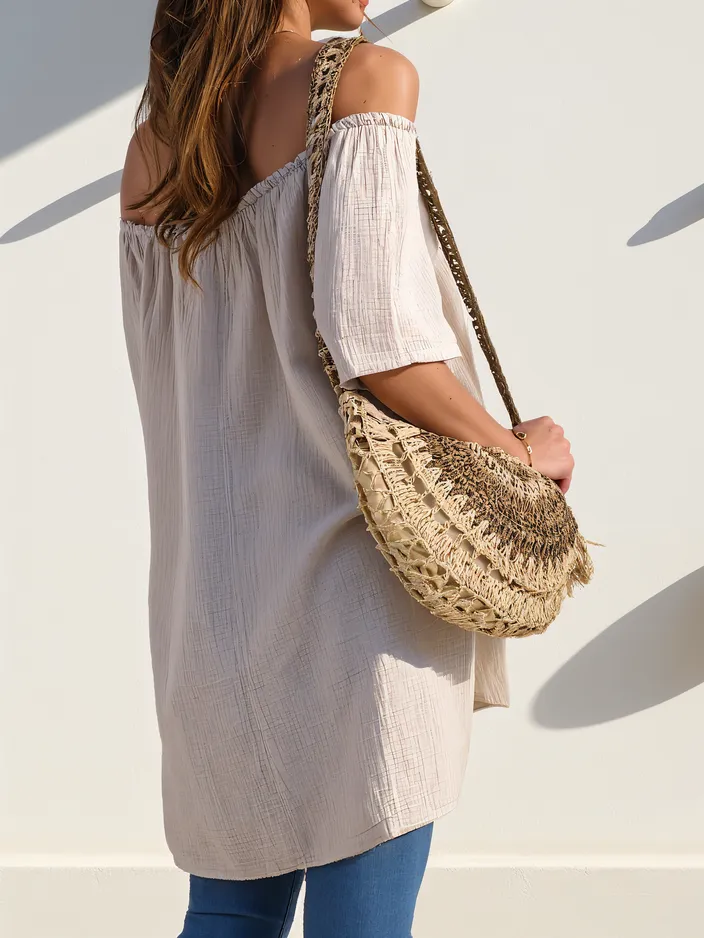 - Elegantiška moteriška medvilninė bluzonė ispaniško stiliaus su subtiliais dekoratyviniais mygtukais. Puikiai tinka šiltoms dienoms, ji derina komfortą su moterišku, romantišku stiliumi.