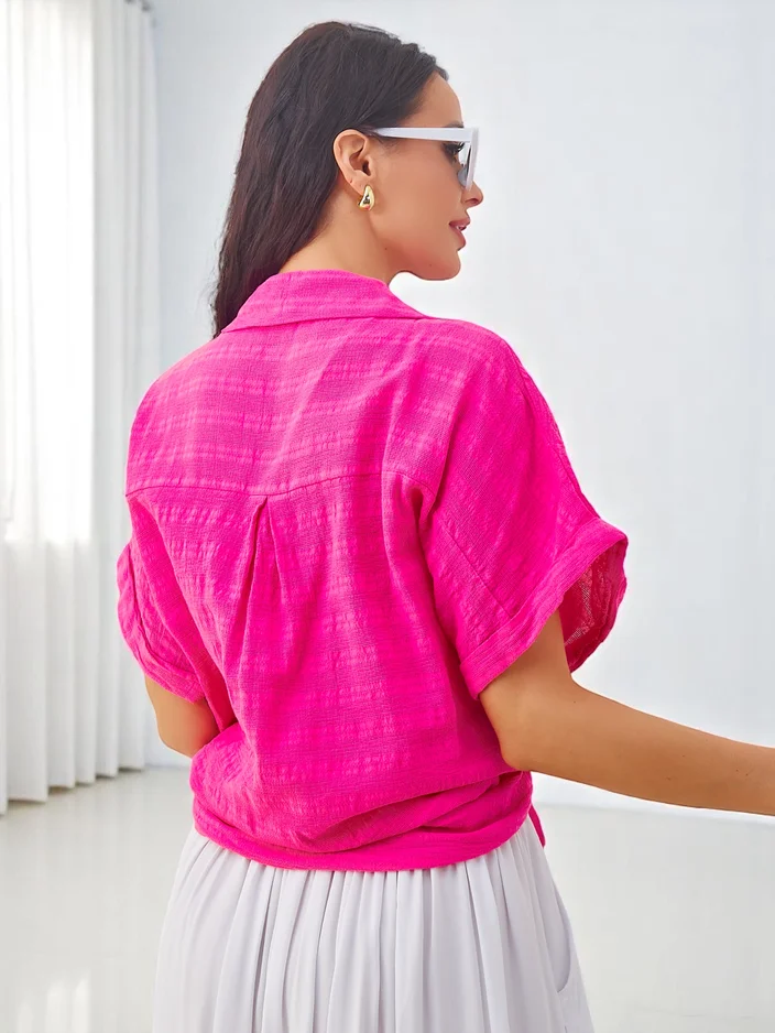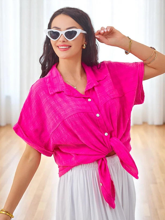 - Medvilnės moterų marškiniai su reljefiniu raštu ir trumpomis rankovėmis. Modelis su V formos iškirpte, mygtukų užsegimu. Būtinas kiekvienos moters garderobe!