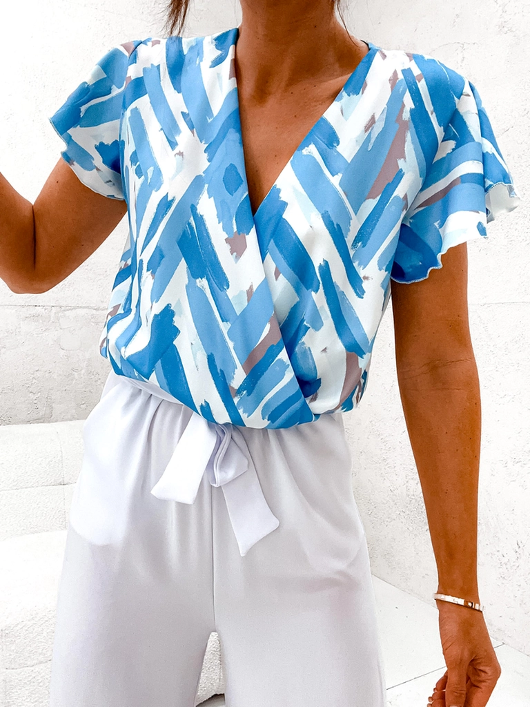 - Nuostabus moteriškas šokis su trumpomis rankovėmis, V formos iškirpte ir elastingu juosmeniu. Modelis turi plačius, ilgus kelnes. Taip pat pridedamas diržas. PAŽYMĖJIMAS: Matavimo tikslumas (+/-) 1 cm.