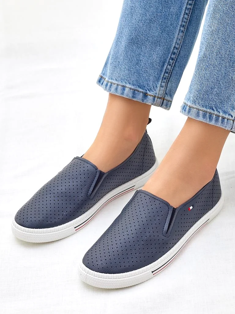 - Perforuoti moteriški šlepetės, pagaminti iš ekologiškos odos. Iškloti audiniu. Puikus pasirinkimas kasdieniam nešiojimui!