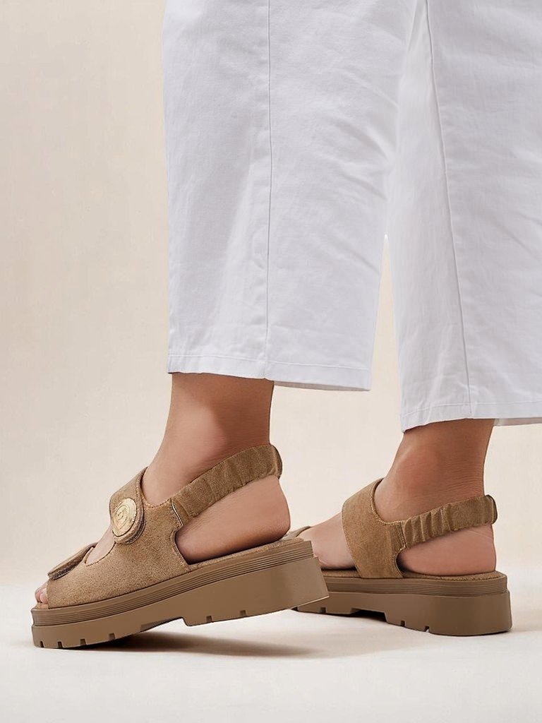 Discover lightness and exceptional comfort with Royalfashion Callista women's sandals inspired by the Italian style. The model is made of high-quality ecological suede leather, both outside and inside (insole), which ensures softness, breathability and a pleasant touch for the skin of the feet. The 5 cm high platform made of light, flexible material guarantees great shock absorption and comfort even during longer walks. Velcro fastening allows for quick adjustment to individual needs, and the lack of a toe ensures excellent ventilation - an ideal solution for warm days. The model is distinguished by a fashionable, minimalist design without patterns and a decorative accent resembling a coin in gold, which adds subtle elegance to the whole. The sandals perfectly fit into current trends - massive platform, beige shades and natural materials reign this season on catwalks and city streets.:- soft, skin-friendly eco-suede lining,- flexible sole increases wearing comfort every day,- light and stable - ideal for walks and work,- Velcro fastening allows you to quickly take off and put on shoes,- neutral beige color matches most styles.:1. For everyday use - combine sandals with white 7/8 jeans and an oversized linen shirt or T-shirt. 2. In boho style - combine with a summer maxi dress with flowers and a large basket bag.3. Urban casual - choose pastel shorts and a light cardigan.:To maintain freshness and aesthetics, clean the sandals gently with a damp cloth and a suede brush. Avoid contact with water and prolonged exposure to sunlight. Store in a airy place, preferably in a cloth bag, to avoid deformation.Choose Royalfashion Callista sandals if you value modernity, comfort and timeless elegance. This model will certainly become your summer favorite, regardless of the occasion.