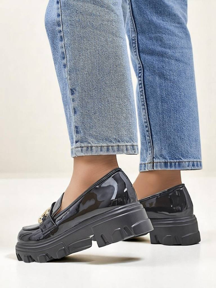 Stilingos moteriškos loafers, pagamintos iš lakuotos ekologiškos odos elegantiškos juodos spalvos. Šis modelis išsiskiria masyvia, reljefine padu, kuri užtikrina dėvėjimo komfortą ir puikų sukibimą. Priekyje yra auksinės spalvos apdaila, primenanti žąslų stilių, suteikianti batams prašmatnumo. Vidus išklotas minkšta medžiaga, kuri padidina avėjimo patogumą. Puikiai tinka tiek laisvalaikiui, tiek elegantiškesniems deriniams. Puikus pasirinkimas rudens–pavasario sezonui.