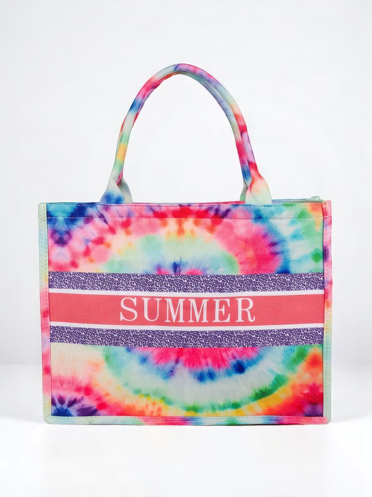 - Didelis, moteriškas audinio krepšys su spalvingu motyvu ir užrašu "SUMMER". Vienas skyrius, lengvas ir talpus – puikiai tiks paplūdimiui, atostogoms ir vasaros deriniams!