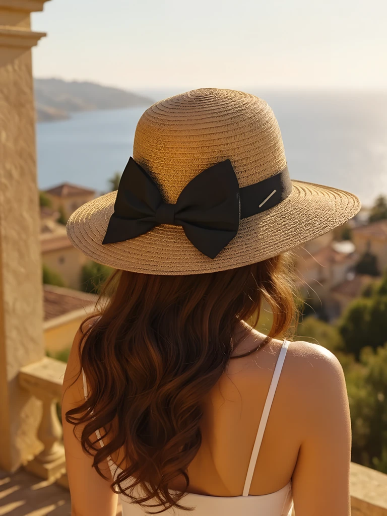 - Moteriška šiaudinė skrybėlė su plačiu snapeliu ir išraiškinga juostele su didele kaspinu. Stilinga, lengva ir orui pralaidi – puikiai tinka vasarai, paplūdimiui bei elegantiškiems, moteriškiems deriniams!