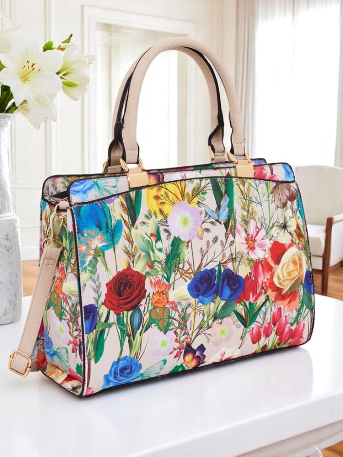 • Didelė gėlėta rankinė iš eko odos su 1 skyriumi su pertvara, 2 išorinėmis kišenėmis ir 3 vidinėmis kišenėmis. Reguliuojamas, nuimamas dirželis užtikrina patogumą ir funkcionalumą.