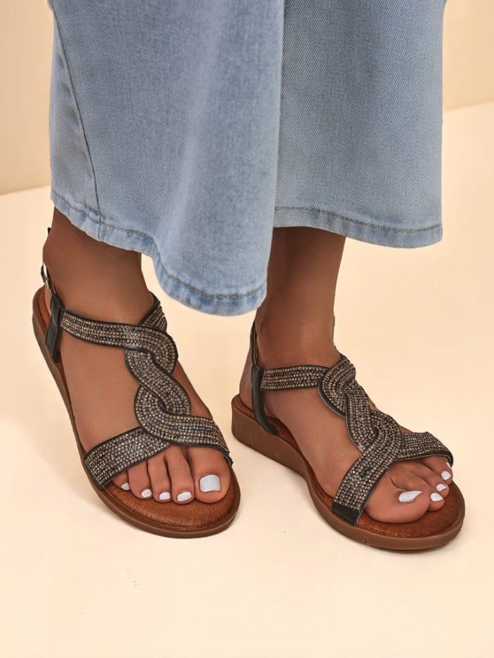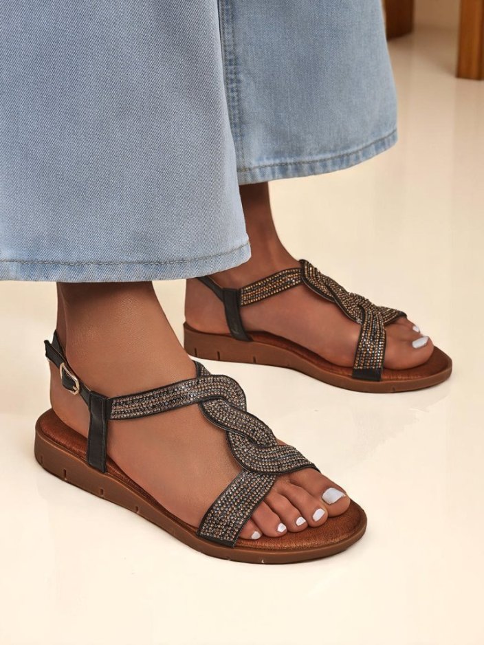 - Płaskie sandały damskie z eko skóry, zdobione cyrkoniami. Lekkie, wygodne i eleganckie – idealne na lato, codzienne wyjścia i letnie wieczory z nutą blasku.