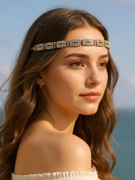 Aurelia headband? Straight outta Italy, vintage vibes only. Hypoallergenic metal and hand-set crystals? We ain't messin' around. Built to last, comfy AF, all night long. Polished to perfection, quality checked, safe for your skin, period. Flexible fit, zero pressure, just pure drip. Crystals poppin', catchin' light, makin' you shine brighter than a supernova. Weddings, parties, photoshoots, dates – you name it, she's ready. Looks fire with waves, buns, updos – the possibilities are endless. Styling tips? 1. Boho queen: white maxi dress, sandals, woven bag – festival vibes activated. 2. Glam goddess: black cocktail dress, subtle bling – pure charm overload. 3. Casual flex: denim jacket, tee, loose hair – everyday slay, no sweat. Keep it dry, bagged up tight. No water, perfumes, chemicals – treat her like the queen she is. Soft cloth clean only. Aurelia's the must-have for that unique, elegant drip that'll have everyone droolin'.