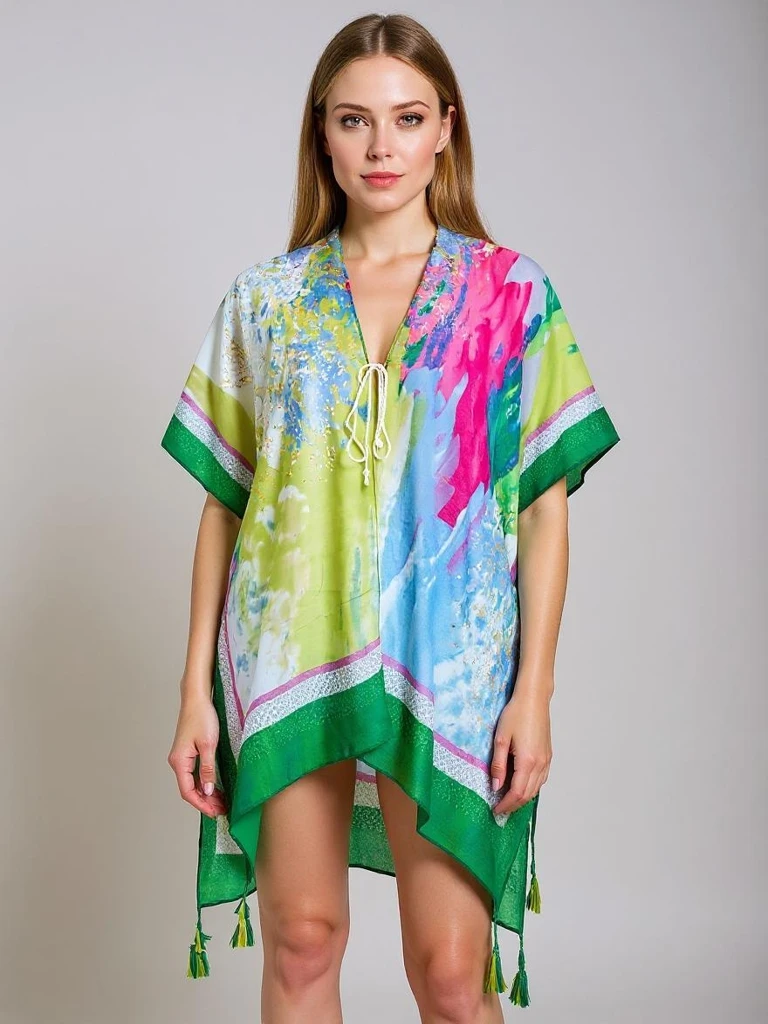 - Letnia tunika plażowa typu pareo z dekoltem w serek i asymetrycznym dołem to stylowy must-have na wakacje. Zwiewna, lekka tkanina i efektowny wzór podkreślają kobiecość, a luźny krój zapewnia komfort w upalne dni. Idealna na plażę i letnie spacery.