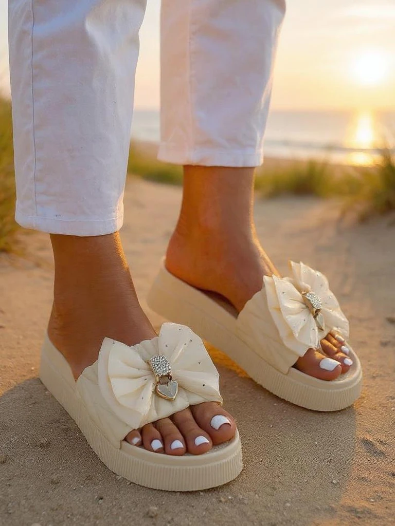 • Yo, platform slides for ladies, straight fire for summer. That bow is eco-leather, fam.