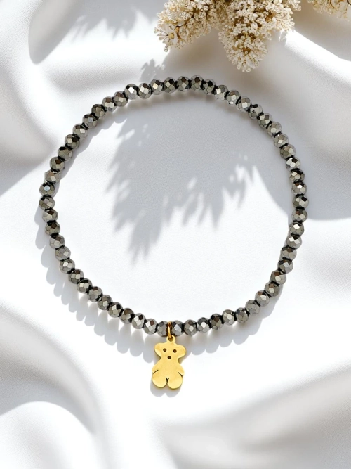 - Apyrankė su karoliukais ir meškučio pakabuku – žavus ir šiltas aksesuaras, simbolizuojantis rūpestį, švelnumą ir vaikišką džiaugsmą. Puikiai tinka kaip dovana ar asmeninis papuošalas, suteikia bet kokiam deriniui saldumo ir nerūpestingumo dvelksmą.