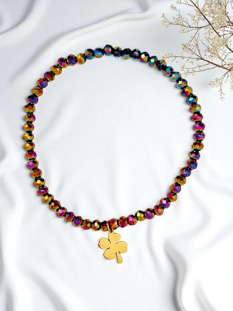 - Apyrankė su karoliukais ir dobilo pakabuku – stilingas laimės talismanas. Subtili ir elegantiška, ji simbolizuoja sėkmę, viltį ir teigiamą energiją. Puikiai tinka kasdieniam dėvėjimui kaip subtilus aksesuaras su unikaliu palinkėjimu.