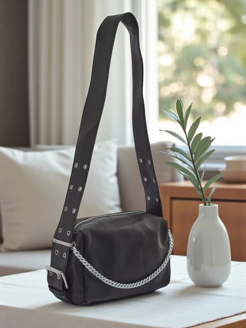 - Maža moteriška rankinė iš ekoodos, su vienu skyriumi užtrauktuku. Stilingas platus dirželis užtikrina patogų nešiojimą, o dekoratyvinė grandinėlė suteikia elegancijos. Puikiai tinka kasdieniam naudojimui ir vakariniams išėjimams – lengva, patogi ir įspūdi