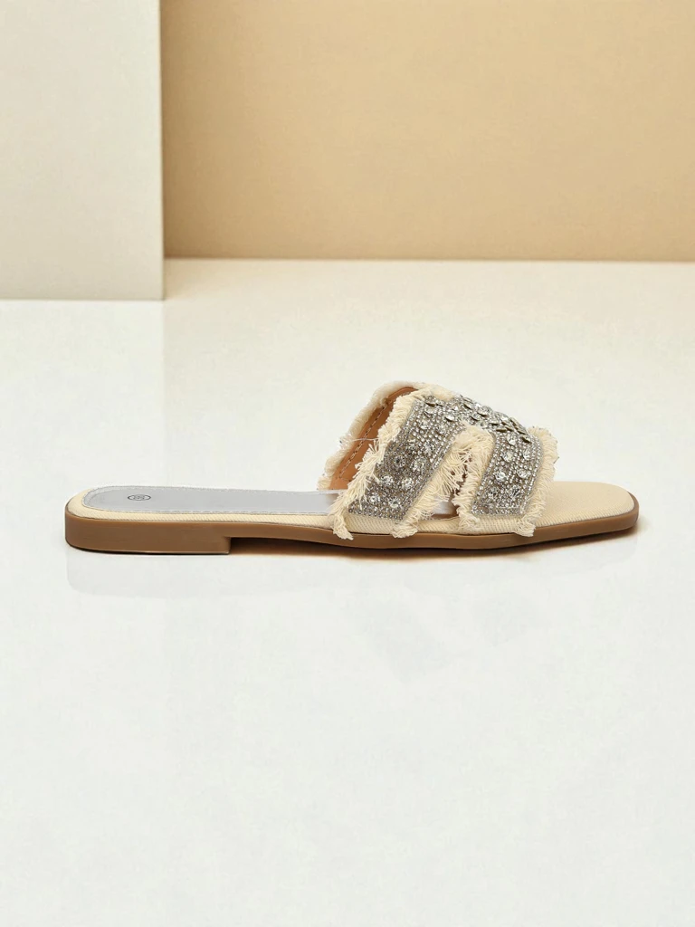 - Plokščios moteriškos šlepetės, pagamintos iš eko odos, puoštos spindinčiais dirbtiniais brangakmeniais. Stilingos ir patogios, puikiai tinka vasarai ir ypatingoms progoms. Jos suteikia spindesio bet kokiai aprangai ir užtikrina komfortą visą dieną.