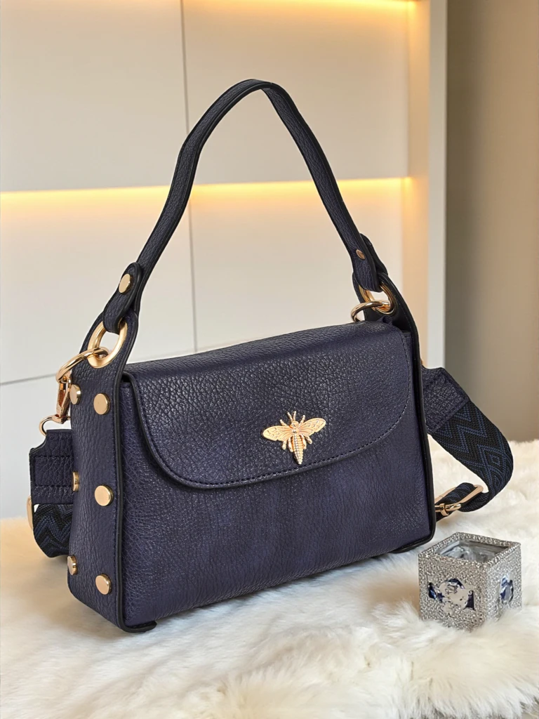 Torebka Damska Melia Cielo – Granatowa Skóra Ekologiczna z Motywem Pszczoły
