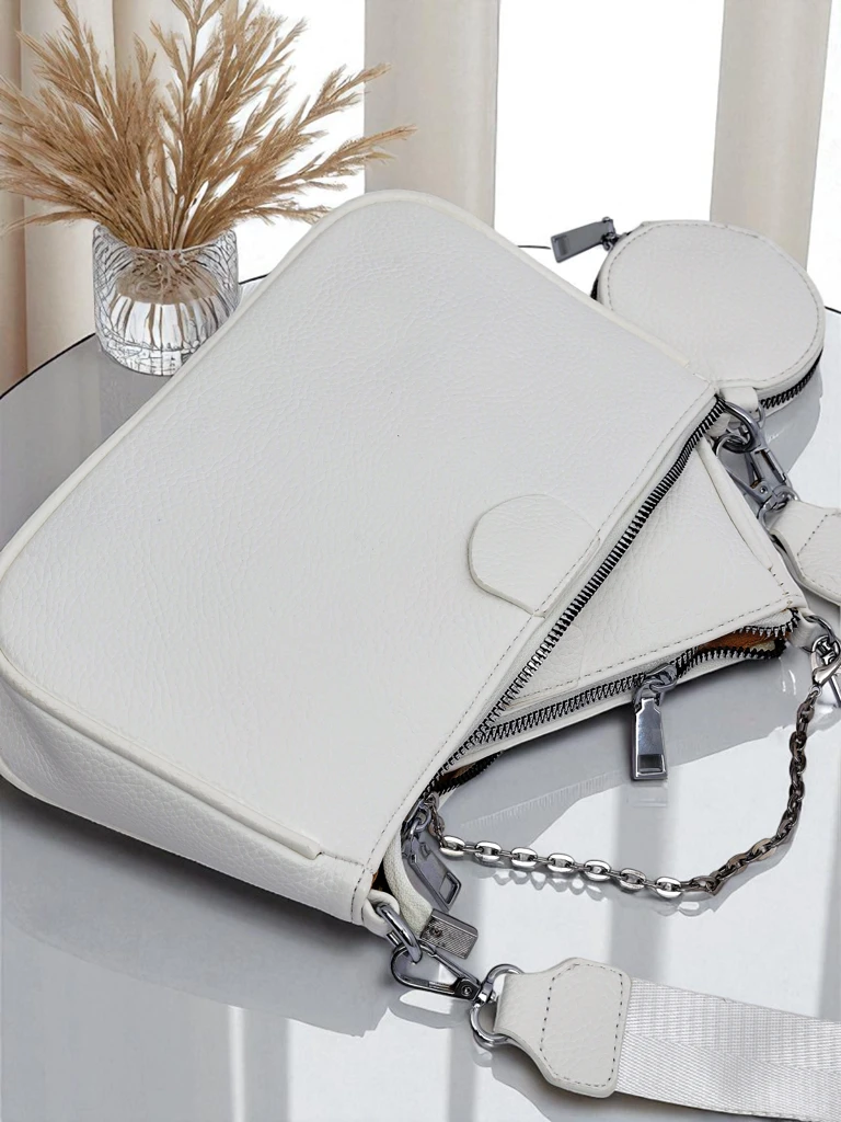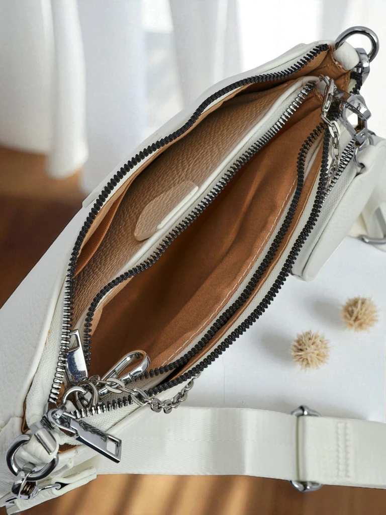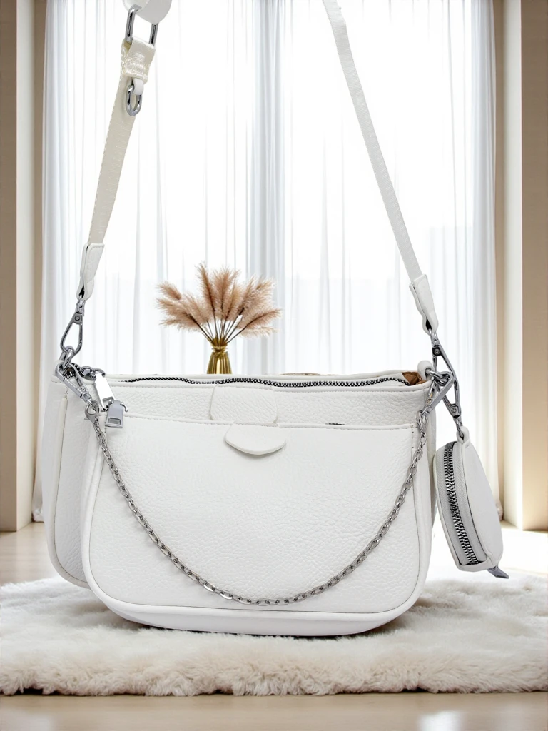 Torebka jest kompaktowa (wysokość 17 cm, szerokość 28 cm, grubość 6 cm), lecz bardzo pojemna dzięki przemyślanemu układowi kieszeni i praktycznym dodatkom: odpinanej saszetce na drobiazgi oraz ozdobnemu łańcuszkowi. Zamek błyskawiczny zapewnia bezpieczeństwo przechowywania, a szeroki, regulowany pasek sprawia, że możesz nosić torebkę wygodnie na ramieniu lub jako crossbody.