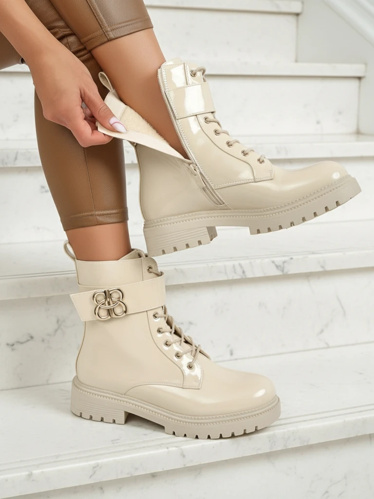 - Beżowe botki damskie z eko skóry, z zamkiem i okrągłym noskiem – nowoczesność, wygoda i styl w jednym.