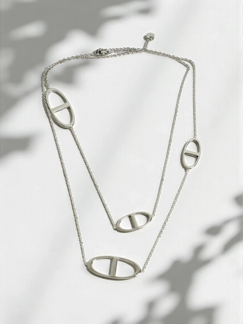 Sidabrinis kaklo papuošalas „Athenia Dualis“ – tai subtilios elegancijos ir modernaus stiliaus derinys. Jis pagamintas iš aukštos kokybės 925 prabos sidabro, kuris garantuoja ilgaamžiškumą ir atsparumą blizgesio praradimui. „Mirror-polish“ apdailos technologija papildomai pabrėžia metalo blizgesį, todėl kaklo papuošalas atrodo itin efektingai tiek dienos, tiek vakaro šviesoje. Grandinėlę puošia stilizuoti geometrinių formų medalionai, įkvėpti klasikinio graikų meno ir itališko dizaino tobulumo. Visi elementai buvo nušlifuoti rankomis ir patikrinta kokybė – tai papuošalas su hipoalerginiu sertifikatu, be nikelio priedų.