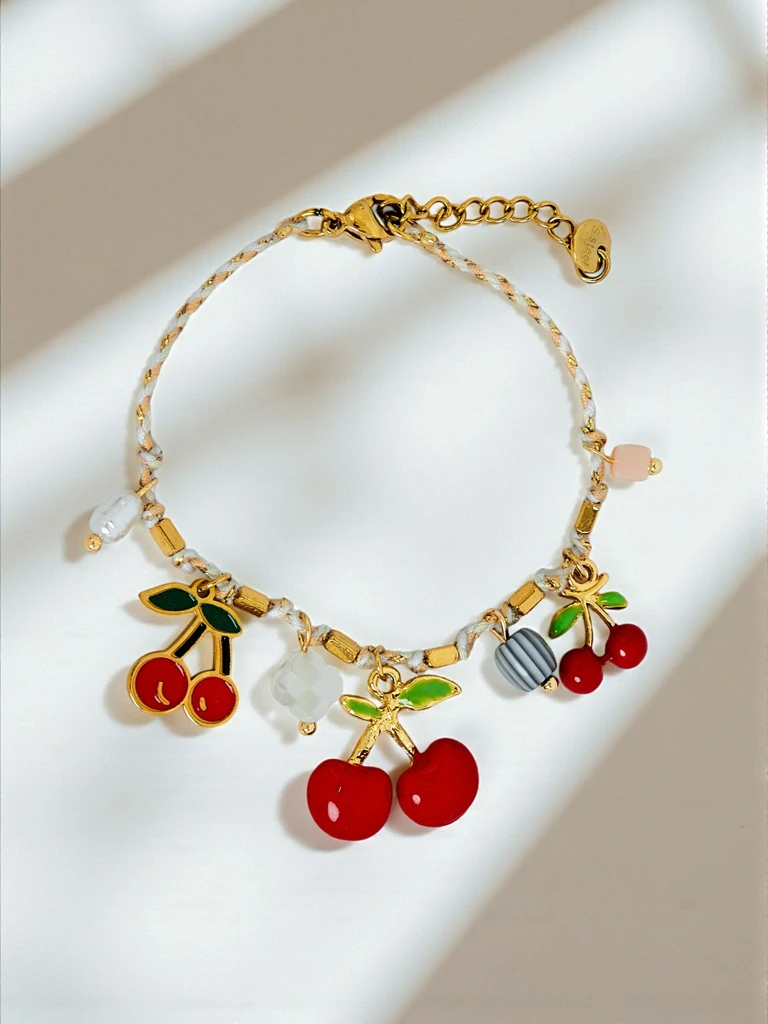 Pavadinimas: Apyrankė Ariadna Cherry – spalvingi pakabukai ir auksinės detalės